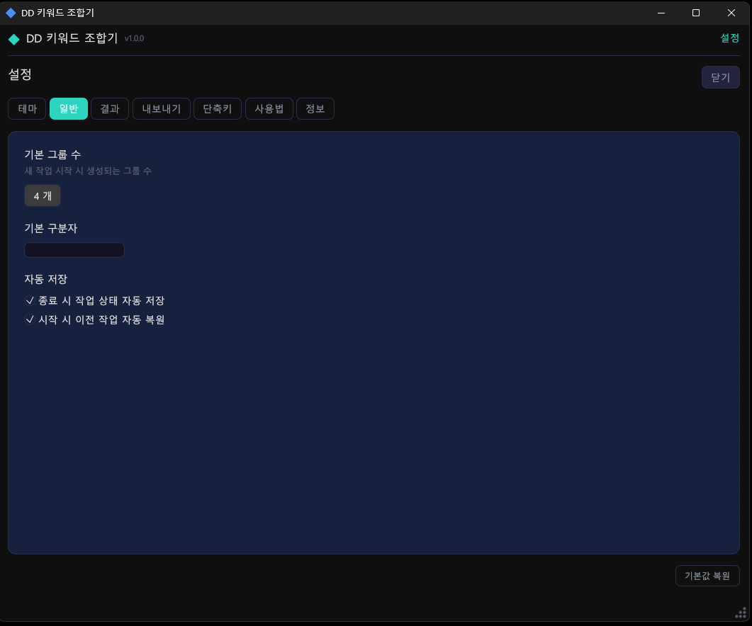| 설정 저장 | JSON (%APPDATA%/DDKeywordCombinator/) |