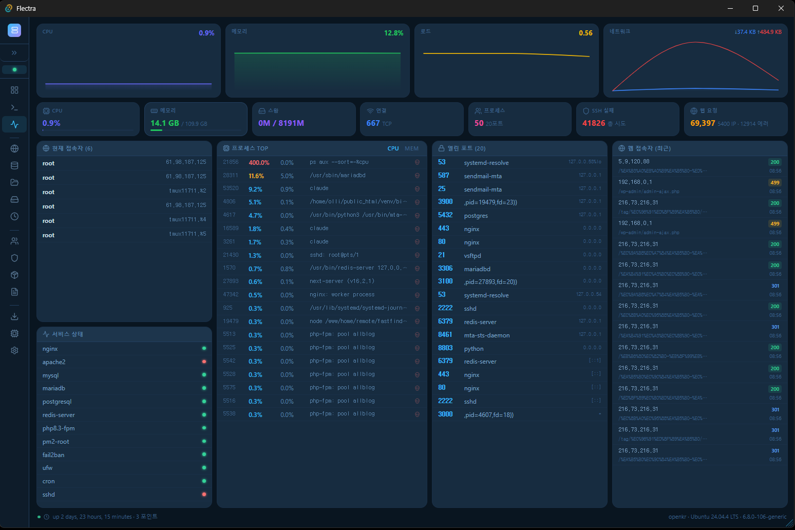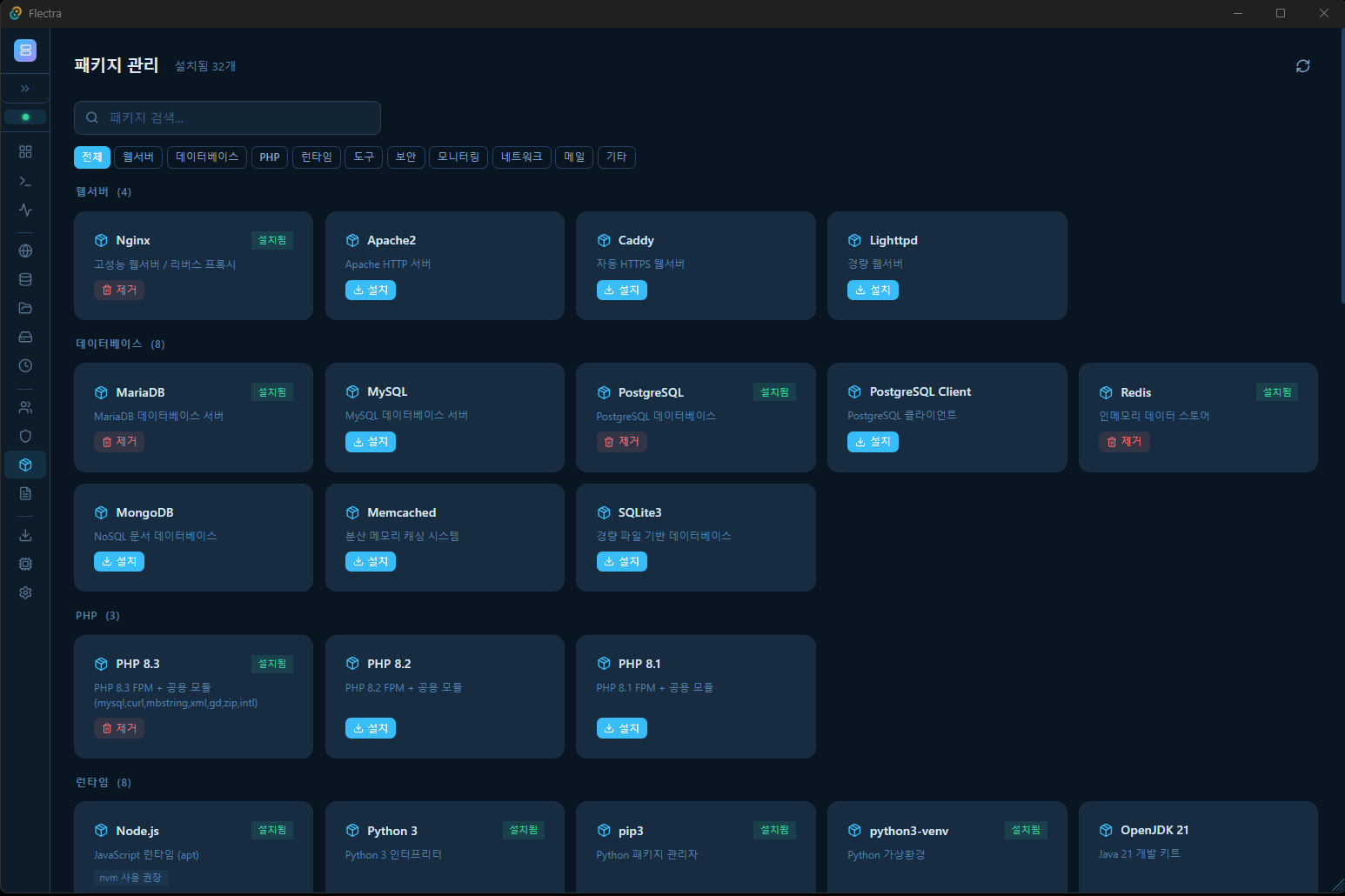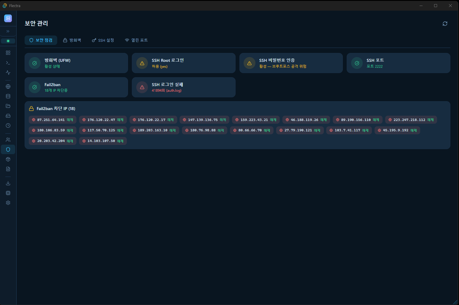 SSH만 있으면 됩니다. 서버에 패널을 설치하면 그 패널 자체가 보안 위험이 됩니다. Flectra는 서버를 건드리지 않습니다. 내 PC에서 SSH로 연결할 뿐입니다.