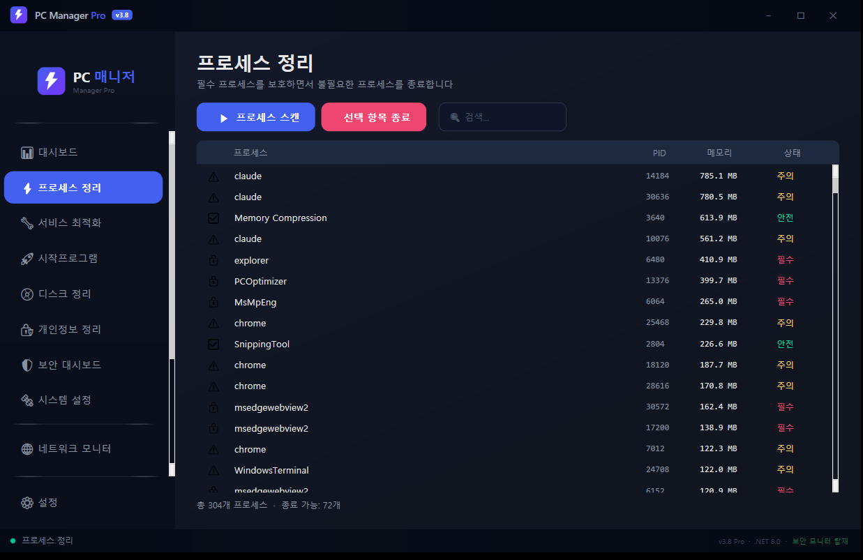 - 안전한 프로세스만 종료 (Essential/Caution/Safe 3단계 분류 시스템)