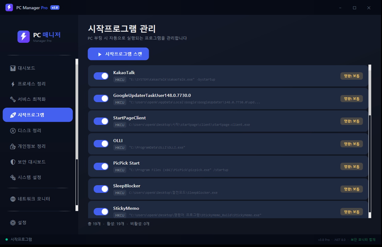 | 경량 포터블 | PCManagerPro_v3.8_Lite.zip | 401 KB | .NET 8.0 런타임 필요 |