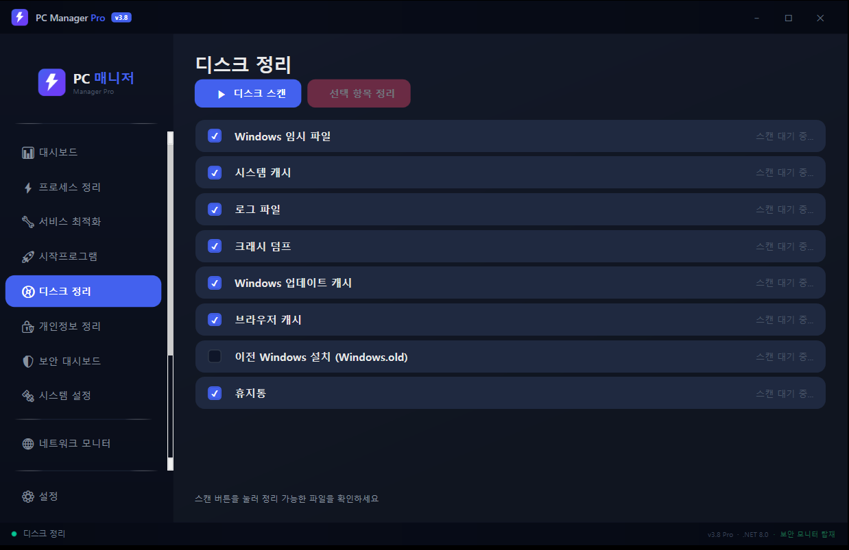 - 8개 정리 카테고리: Windows 임시 파일, 시스템 캐시, 로그 파일, 크래시 덤프, Windows Update 캐시, 브라우저 캐시 (Chrome/Edge/Whale), Windows.old, 휴지통