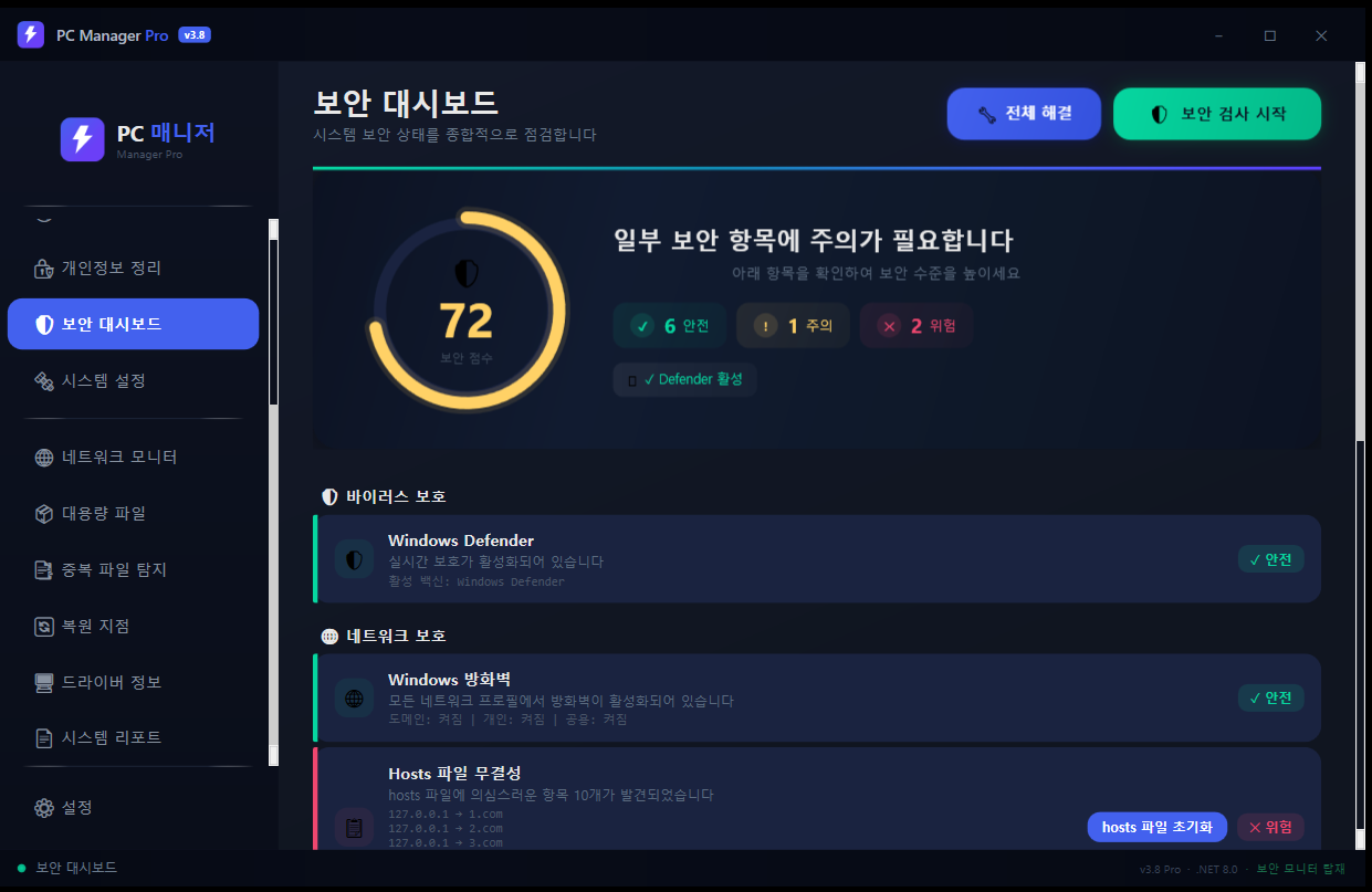 - 9개 항목 종합 보안 검사: Defender, 방화벽(3개 프로필), UAC, Windows 업데이트, Hosts 변조, 의심 프로세스(18종), 네트워크 연결, 시스템 파일 무결성(DLL 8개), 계정 보안