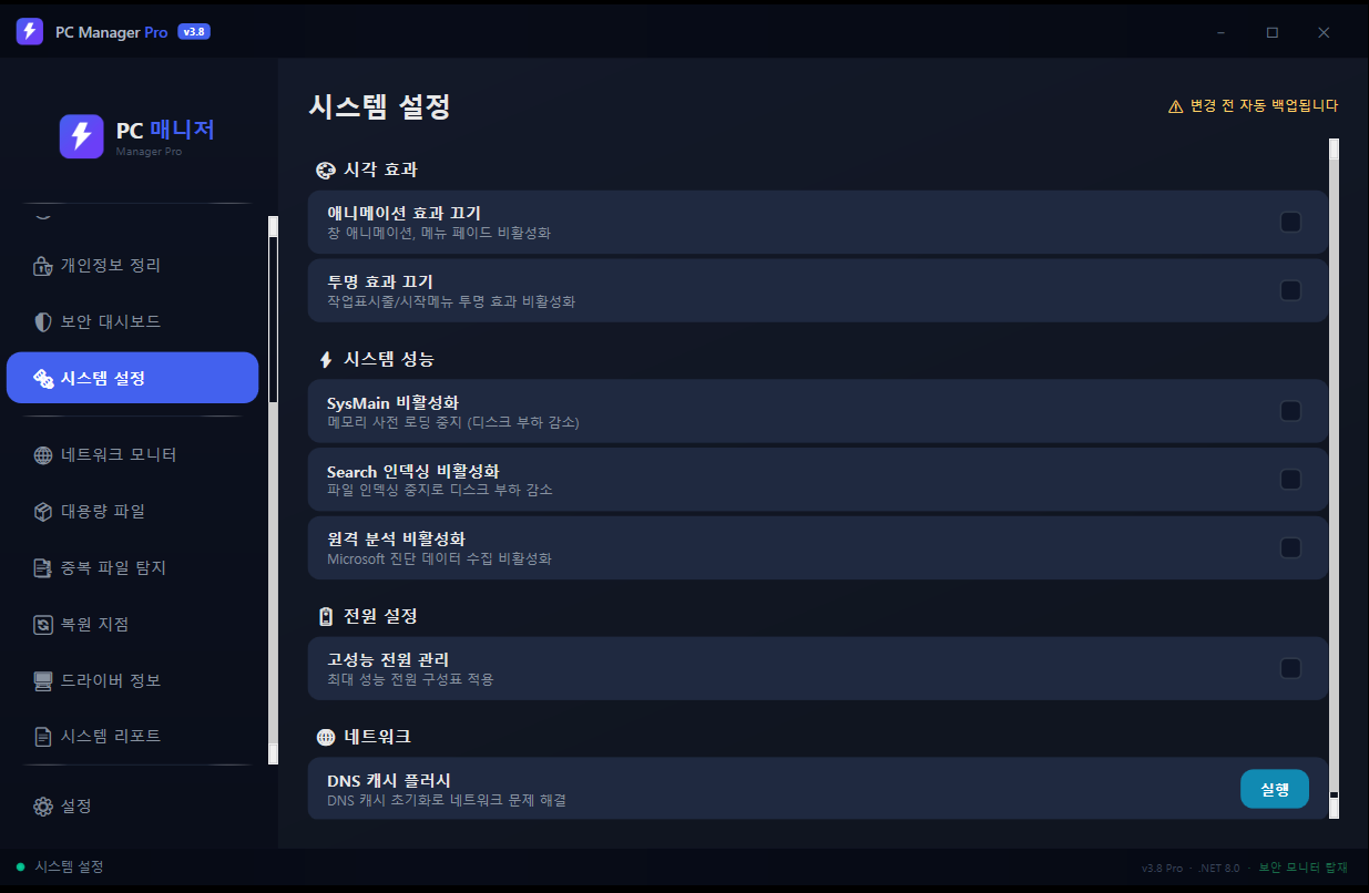 - 7가지 최적화: 애니메이션 비활성화, 투명 효과 비활성화, SysMain 비활성화, 검색 인덱싱 비활성화, 텔레메트리 비활성화, 고성능 전원 플랜, DNS 캐시 플러시