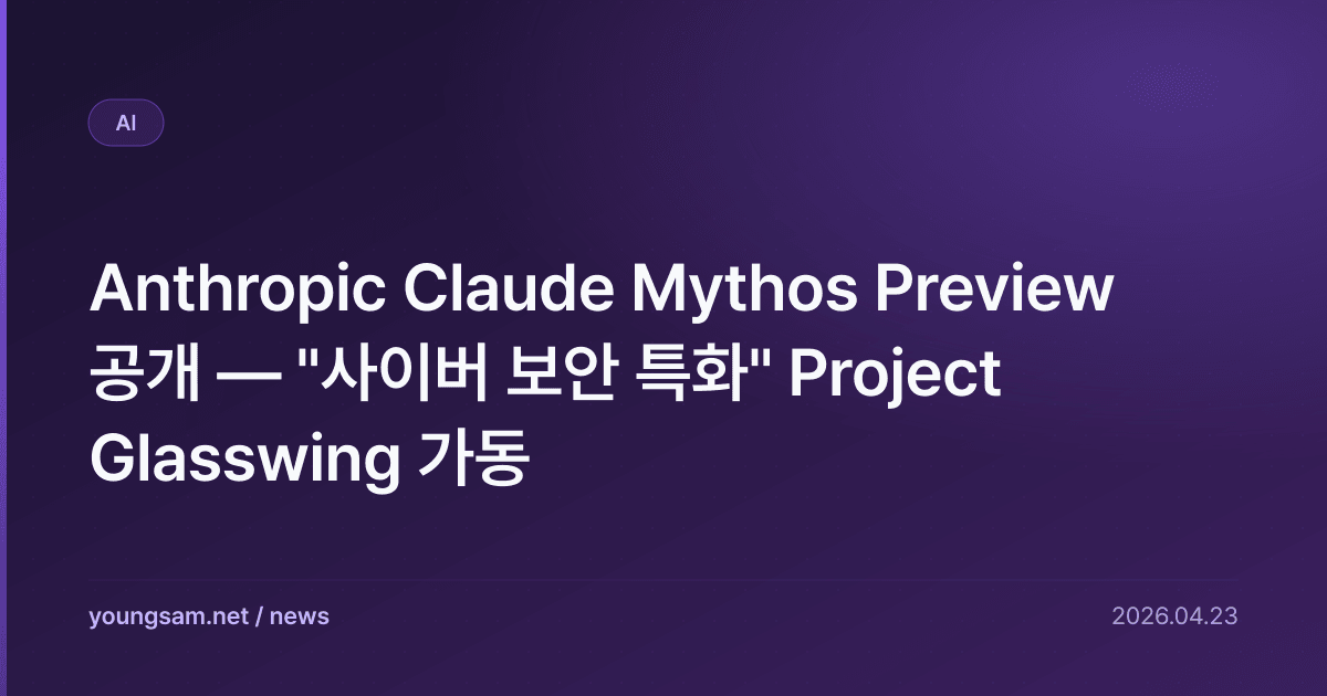 Anthropic이 2026년 4월 23일 신규 프런티어 모델 Claude Mythos Preview를 공개했다. 일반 코드·언어 능력은 Opus 4.7과 비슷하거나 약간 앞서지만, 사이버 보안 작업에서 압도적 성능을 보인다는 것이 핵심 차별점이다.