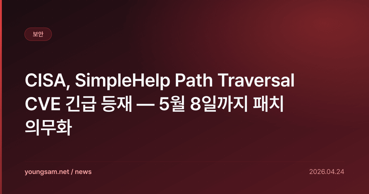 미국 사이버보안인프라보안국(CISA)이 4월 24일 SimpleHelp Path Traversal 취약점을 Known Exploited Vulnerabilities(KEV) 카탈로그에 등재했다. 미국 연방기관은 BOD 22-01에 따라 2026-05-08까지 패치 또는 사용 중단이 의무화된다.