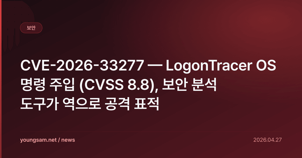 일본 JPCERT/CC가 개발·운영하는 윈도우 이벤트 로그 분석 도구 LogonTracer의 v2.0 미만 버전에서 OS 명령 주입(Command Injection) 취약점이 4월 27일 공개됐다. CVSS 8.8의 high 등급이며, CVE 식별자는 CVE-2026-33277이다.