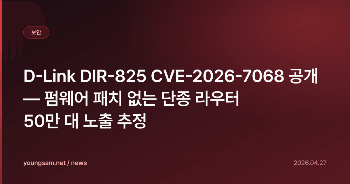 D-Link 가정용 라우터 DIR-825 v3.00b32 펌웨어에서 버퍼 오버플로 취약점이 4월 27일 공개됐다. CVE 식별자는 CVE-2026-7068이며, CVSS 8.8 high 등급이다. 더 큰 문제는 이 모델이 이미 단종되어 D-Link가 펌웨어 패치를 제공하지 않는다는 점이다.
