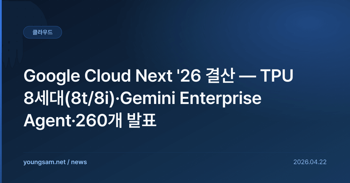 Google Cloud Next '26이 4월 22일 라스베이거스에서 폐막했다. 한 주간 진행된 행사에서 Google은 260개 이상의 제품·파트너·고객 발표를 쏟아냈다. 핵심은 세 가지다: TPU 8세대, Gemini Enterprise Agent Platform, Agentic Defense.
