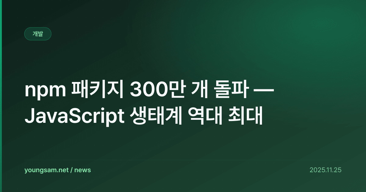 npm 레지스트리에 등록된 패키지 수가 공식적으로 300만 개를 돌파했다. 이는 JavaScript 생태계가 시작된 이래 최대 규모로, 세계 최대의 소프트웨어 레지스트리로서의 입지를 더욱 공고히 했다.