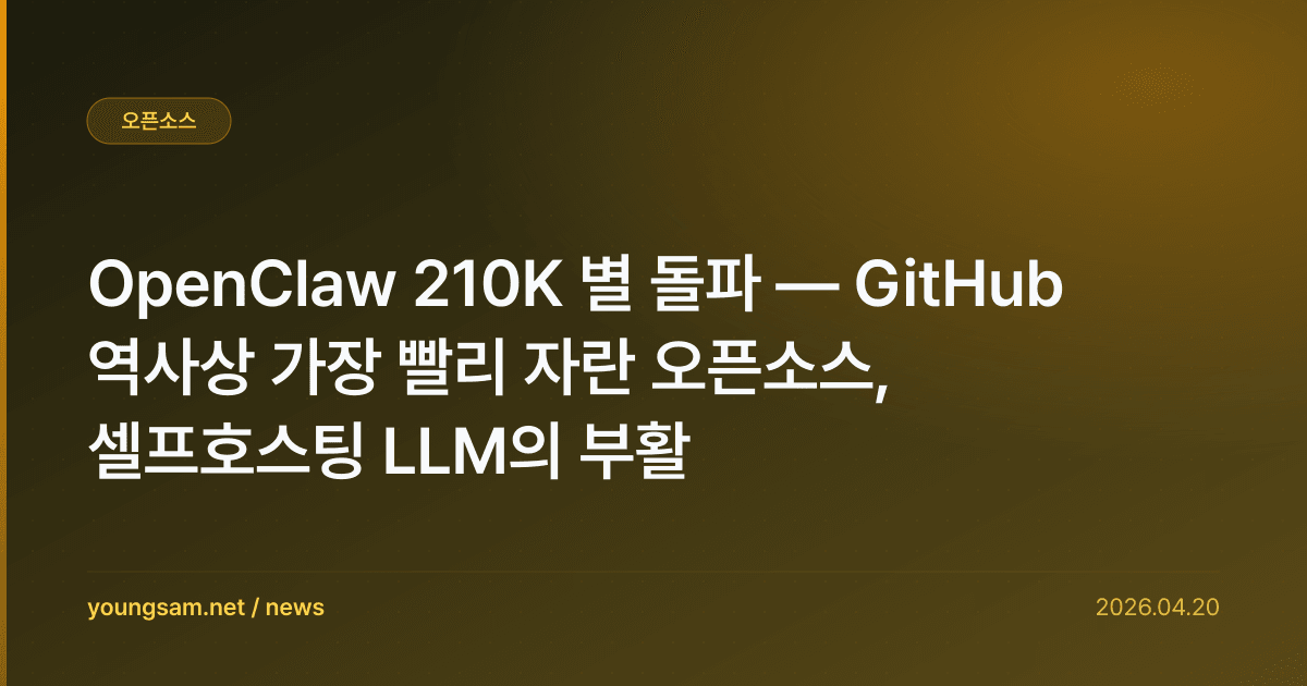 오픈소스 셀프호스팅 LLM 운영 도구 OpenClaw가 GitHub 별 21만 개를 돌파했다. 2026년 1월 말 9,000개 수준이었던 것이 4월 19일 21만 개를 넘어 사실상 GitHub 역사상 가장 빠른 성장 곡선을 그렸다.