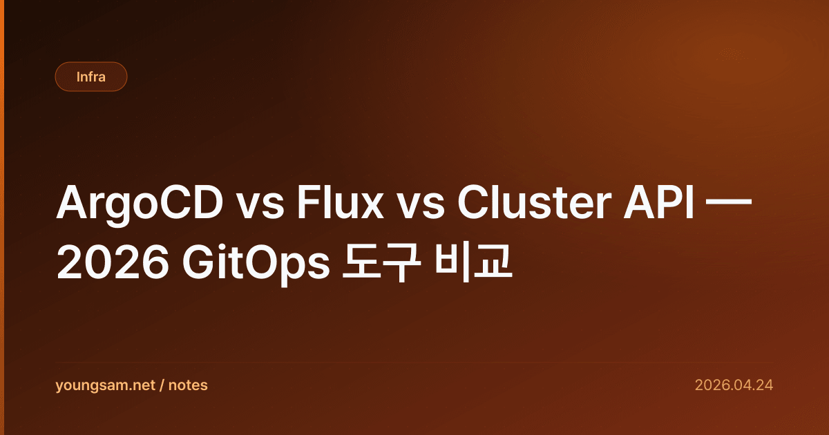 GitOps는 더 이상 옵션이 아닌 표준. Git이 desired state, 도구가 자동 동기화. 2026년 시점 ArgoCD가 시장 60%, Flux 25%, Cluster API 10% (다중 클러스터 특화).