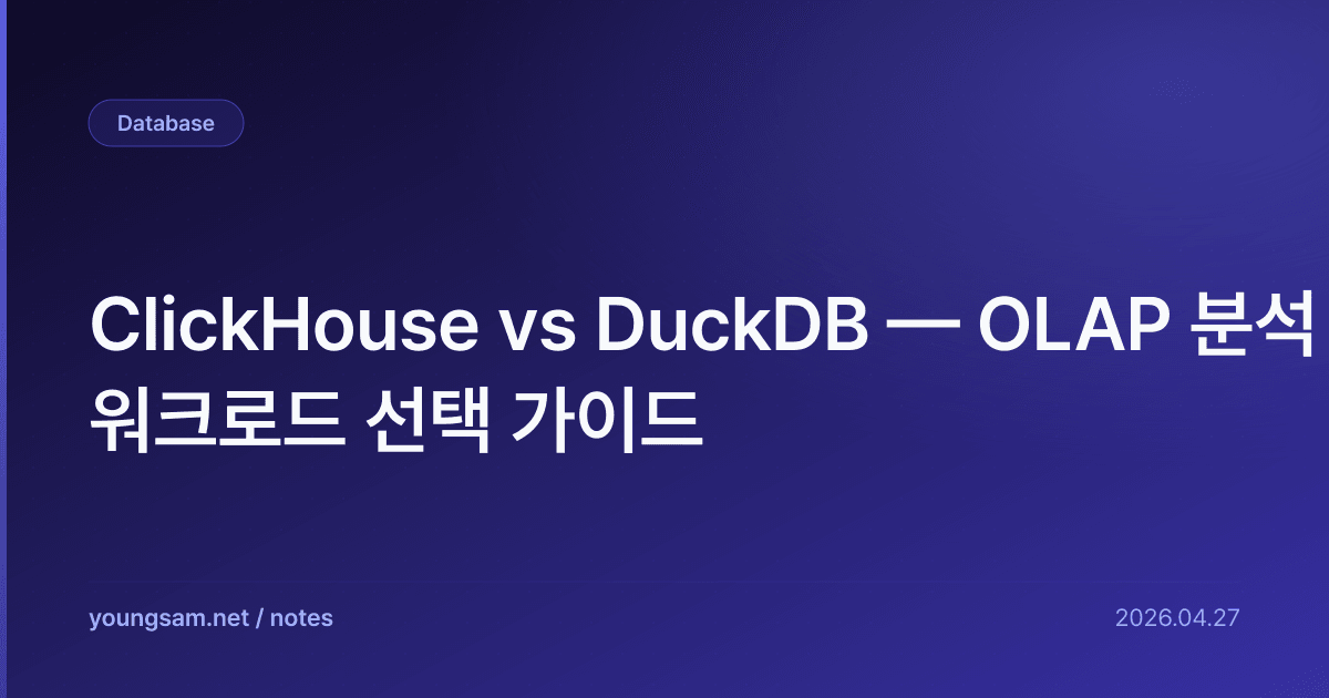 OLAP은 PostgreSQL·MySQL 같은 OLTP DB로는 한계. column-oriented + 압축으로 100배 빠른 쿼리. 2026년 시점 두 표준 — ClickHouse (서버형 대규모) vs DuckDB (임베디드 단일 노드).