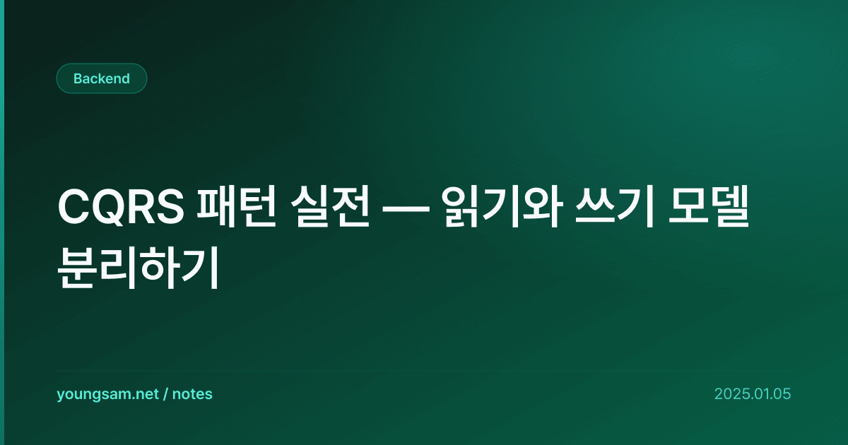 CQRS(Command Query Responsibility Segregation)는 데이터의 읽기(Query)와 쓰기(Command)를 별도의 모델로 분리하는 아키텍처 패턴입니다. 읽기와 쓰기의 요구사항이 크게 다른 시스템에서, 각각을 독립적으로 최적화할 수 있습니다.