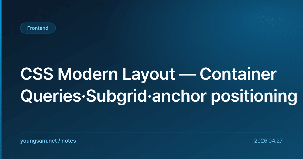 CSS는 2024~2025년 사이에 큰 변화. Container Queries로 반응형이 더 정밀해졌고, Subgrid로 중첩 grid가 깔끔해졌고, Anchor positioning으로 dropdown·tooltip 구현이 혁명적으로 단순해졌다.