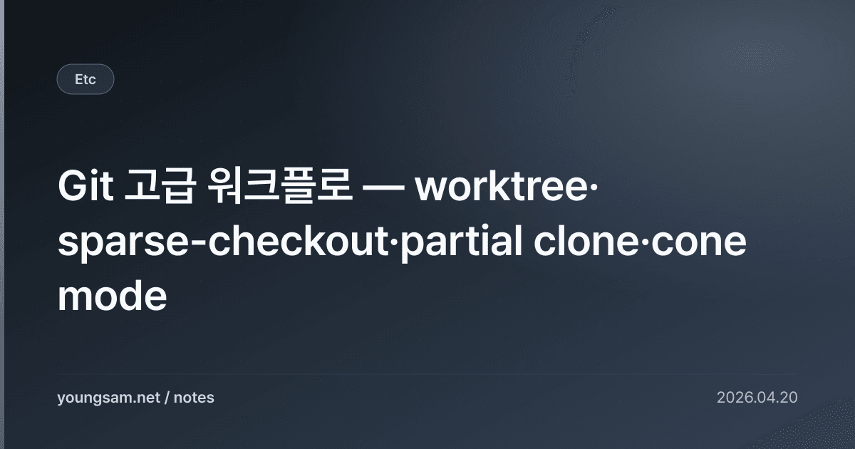 일반적인 Git 명령(checkout·pull·merge)으로 풀리지 않는 상황이 있다. 동시 브랜치 작업, 모노레포에서 일부 디렉토리만 받기, 거대 저장소를 빠르게 시작하기. 이 글은 worktree·sparse-checkout·partial clone·cone mode 4가지를 실전 예시로 정리한다.