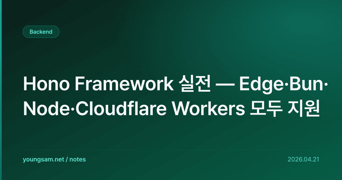 Hono는 일본 개발자가 만든 초경량(11KB) 웹 프레임워크. Express처럼 단순한 API + 모든 JS 런타임 지원 + 매우 빠름. 2026년 4월 기준 GitHub 별 25만 개. Cloudflare Workers·Vercel Edge·AWS Lambda 등 엣지 런타임의 사실상 표준.