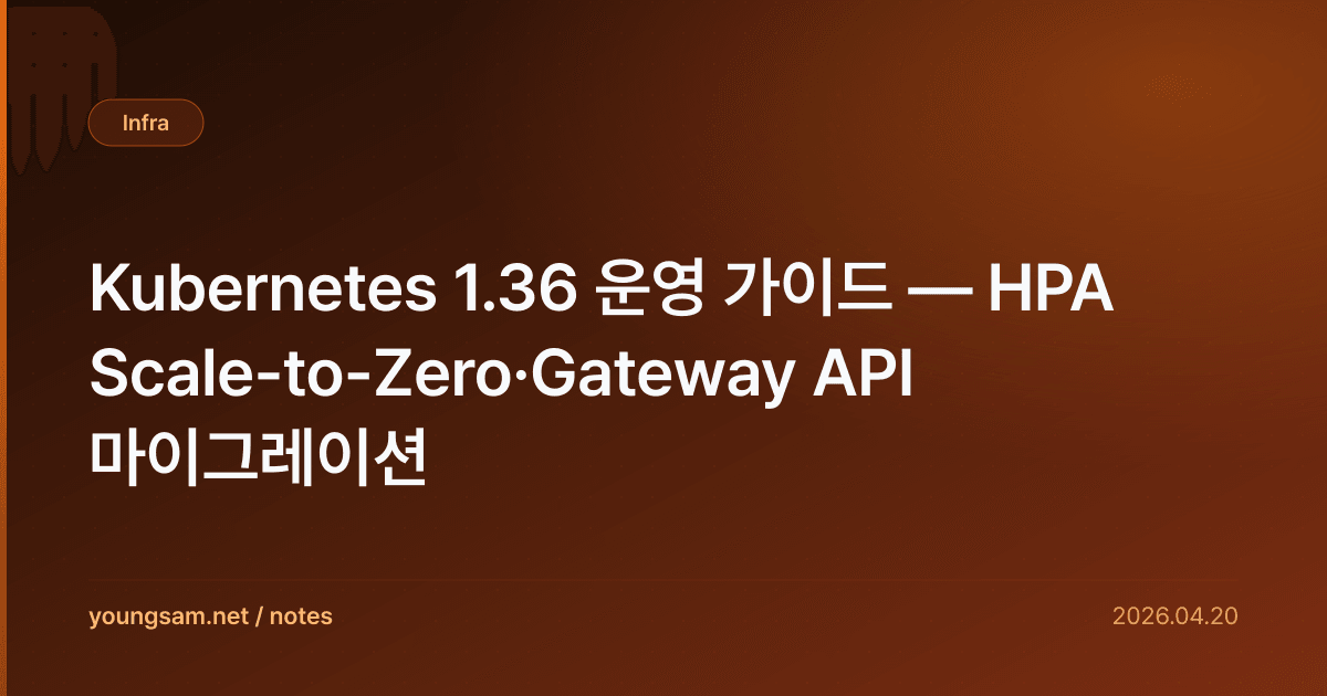 Kubernetes 1.36은 큰 새 기능보다 오래된 빚 청산이 두드러진 릴리스. 7년 묵은 HPA Scale-to-Zero 게이트가 GA, Ingress-NGINX 공식 EOL, IPVS kube-proxy 모드 제거. 운영팀 입장에서 즉시 영향받는 항목이 많다.