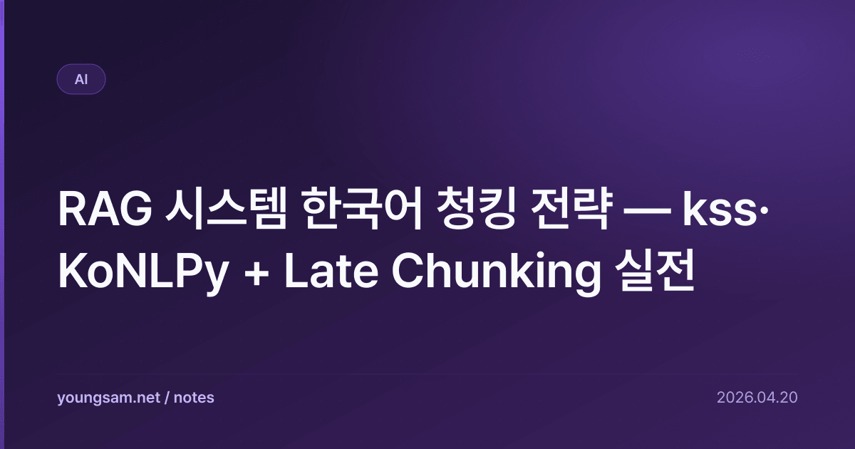 한국어 RAG에서 영어용 default 청킹(500자 + 100자 overlap)을 그대로 쓰면 recall이 낮다. 한국어는 조사·복합어·문장 길이가 영어와 달라 문장 단위 분리가 핵심. kss + Late Chunking 조합이 현재 가장 강력한 baseline.
