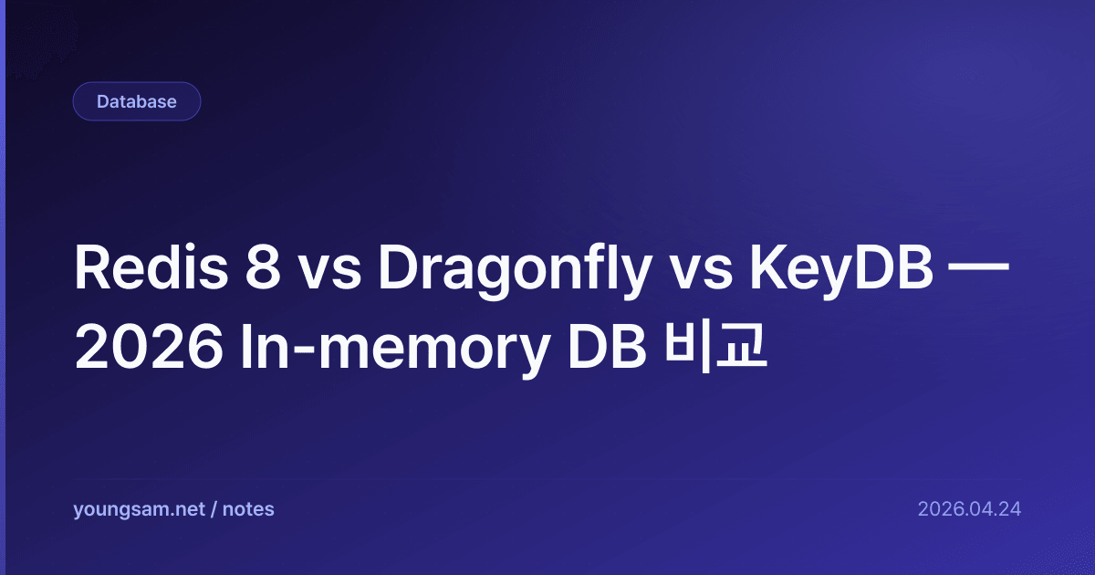 Redis Labs가 2024년 SSPL로 라이센스 변경한 이후 in-memory DB 시장이 분화. Redis 8 (commercial), Valkey (오픈소스 fork, AWS·GCP 주도), Dragonfly (multi-thread), KeyDB (multi-thread, fork) — 4개 옵션이 모두 production-ready.