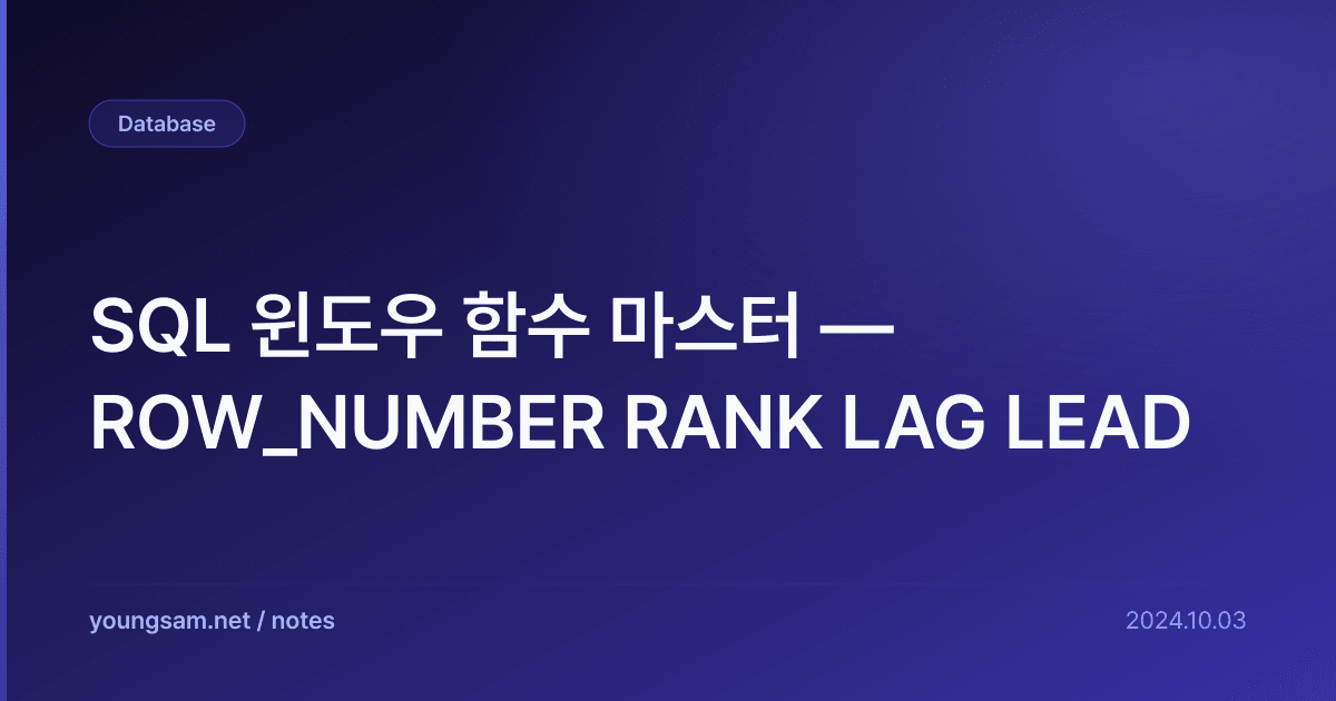 윈도우 함수(Window Function)는 GROUP BY 없이 행별로 집계/분석 연산을 수행하는 SQL 함수입니다. 각 행이 자신이 속한 "윈도우(파티션)" 내에서 계산된 결과를 반환하며, 원본 행을 유지한 채 분석 값을 추가할 수 있습니다.
