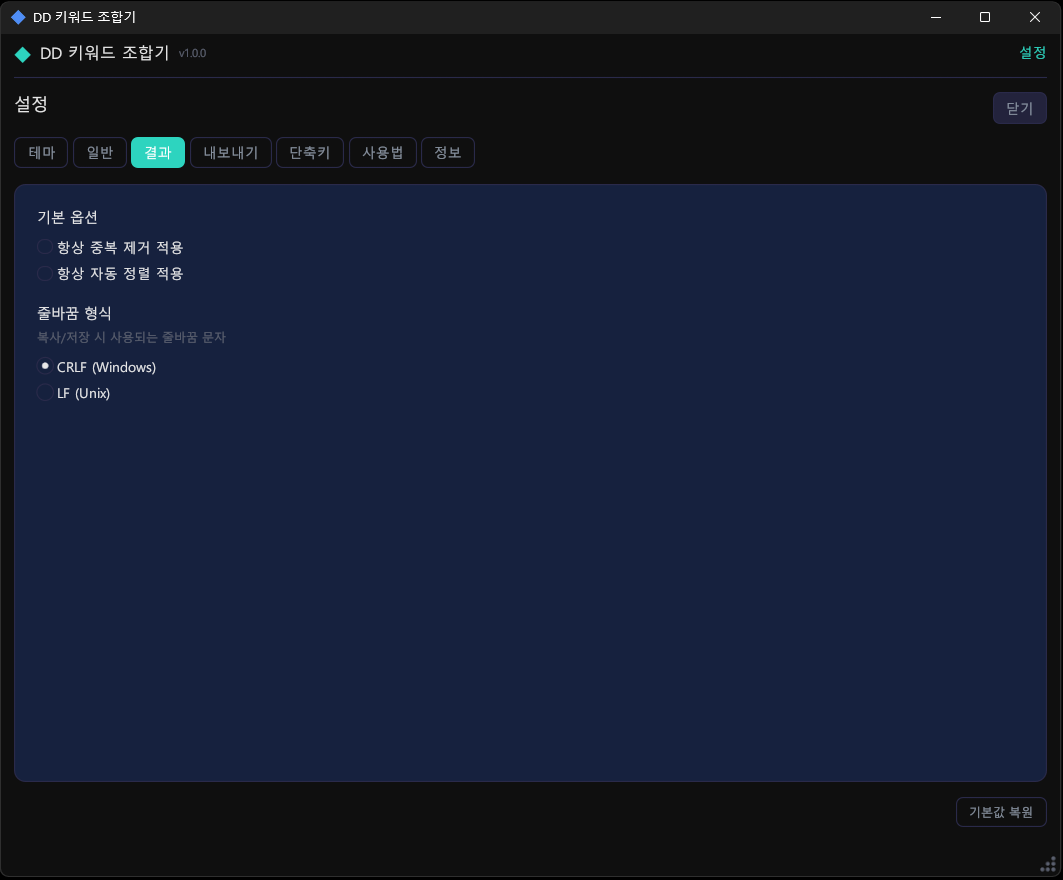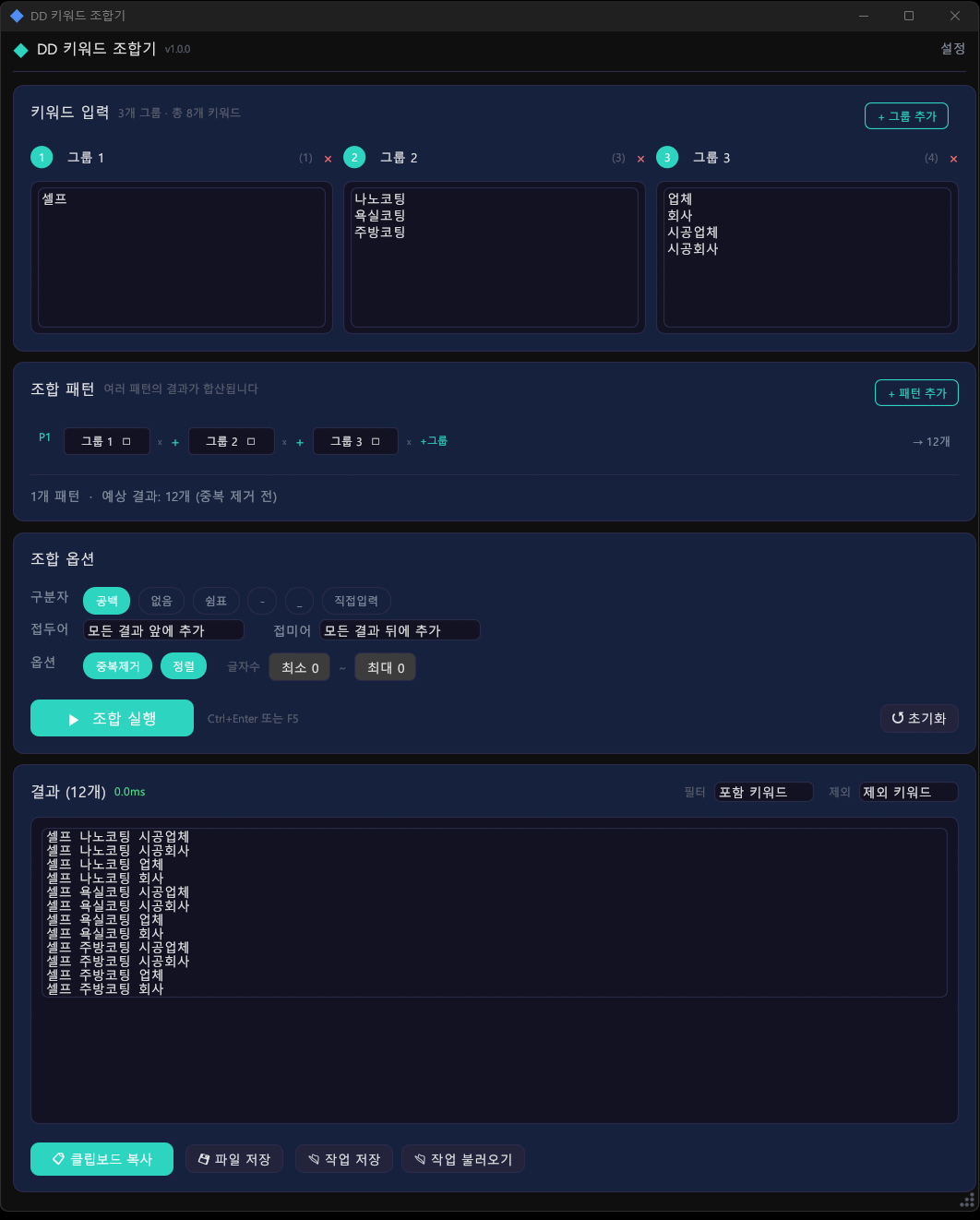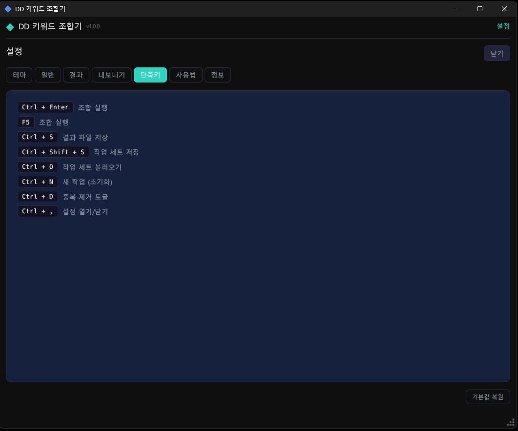 Ctrl+Enter또는F5: 조합 실행Ctrl+S: 결과 파일 저장Ctrl+Shift+S: 작업 세트 저장Ctrl+O: 작업 세트 불러오기Ctrl+N: 새 작업 (초기화)Ctrl+D: 중복 제거 토글Ctrl+,: 설정 열기/닫기