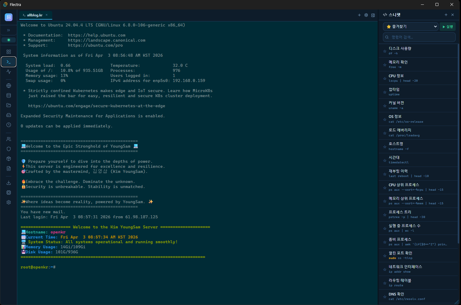 - 200개 이상 내장 커맨드 스니펫 (시스템, 네트워크, Docker, PM2, Git 등)
