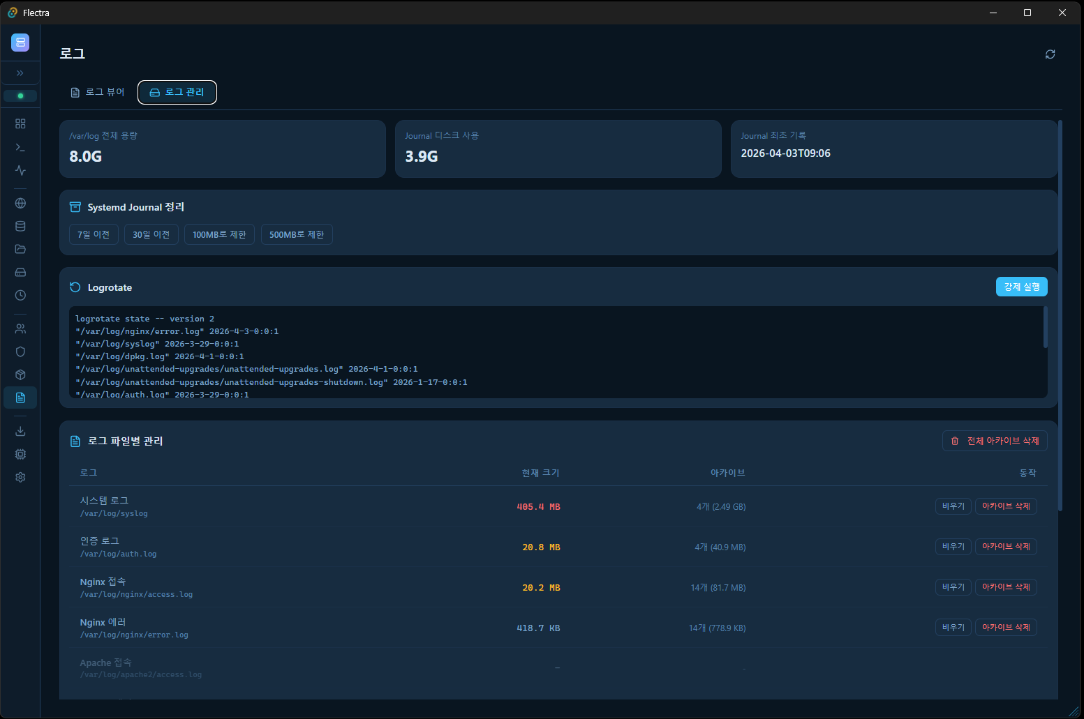 - 로그 관리 — /var/log 용량 확인, Journal vacuum, logrotate 강제 실행